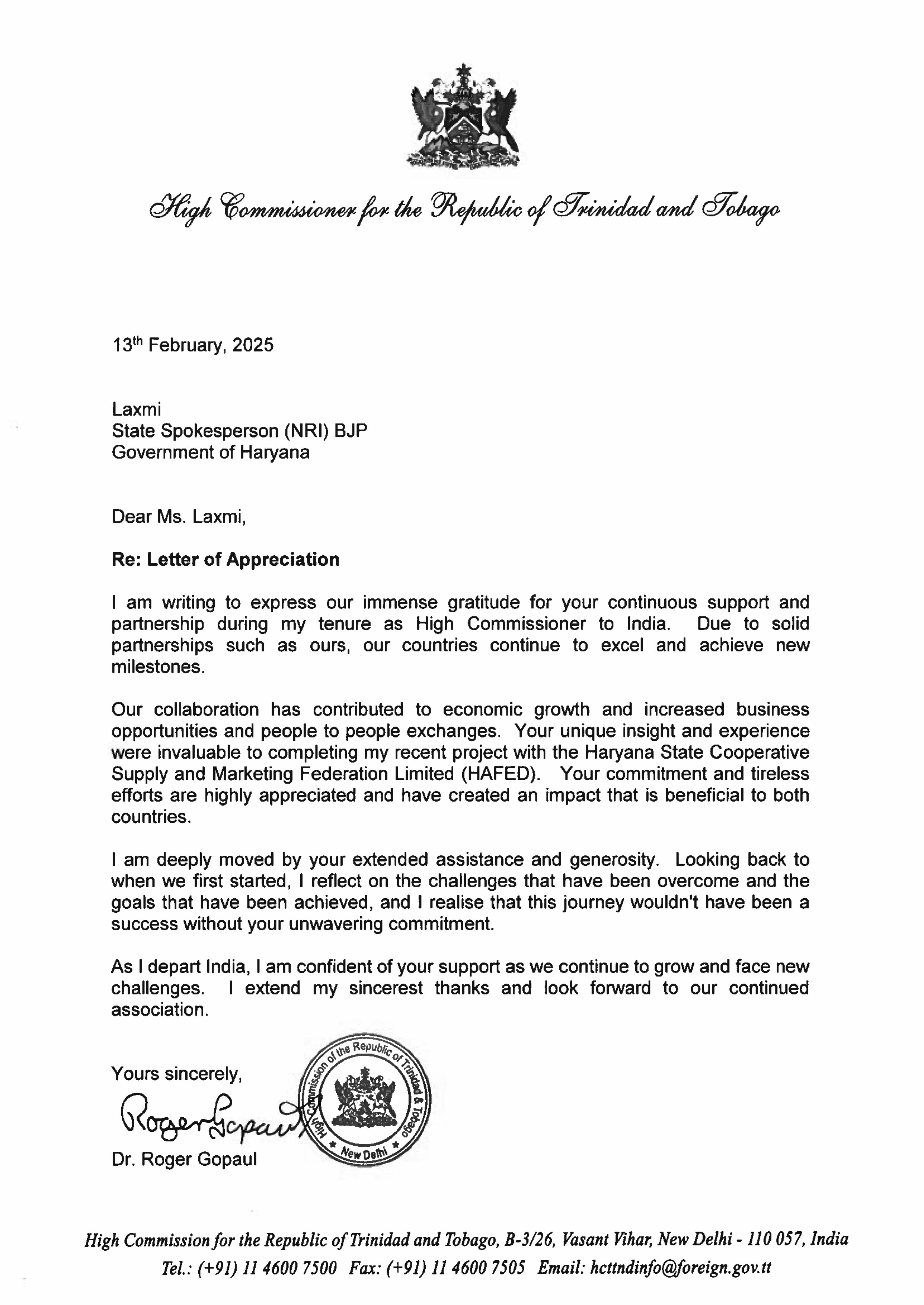 Laxmi was invited to the Celebration of the National Day of Oman at the Embassy of Oman by His Excellency Issa Saleh Abdullah Alshibani, Ambassador of Oman to India. She was also given the opportunity to share her views at a special meeting of GCC countries, where her perspectives were invited and appreciated.